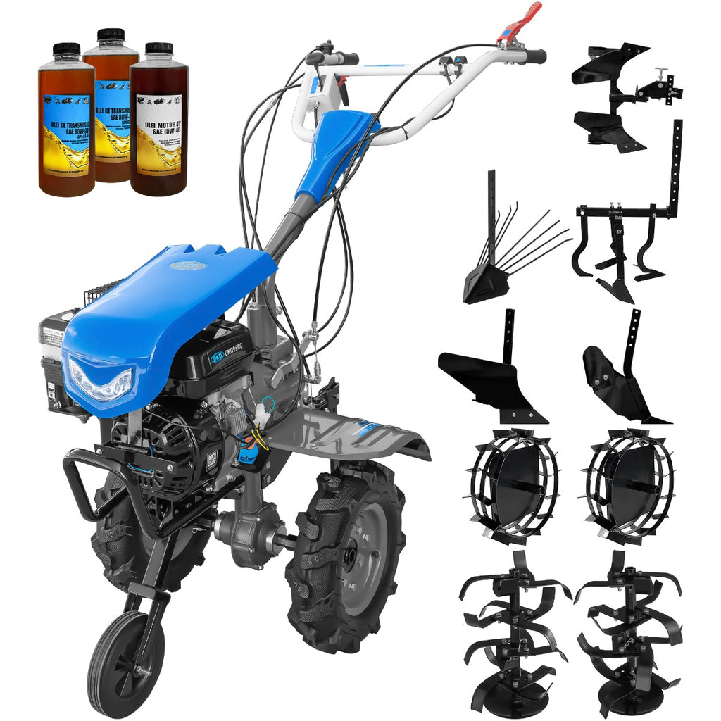 Motocultor DKD 950 G motor 7 CP benzina 2+1 viteze latime lucru 95 cm freze roti cauciuc 4.00x8" capota cu far LED roti metal plug arat rarita reglabila plug cartofi cultivator plug reversibil 3l ulei