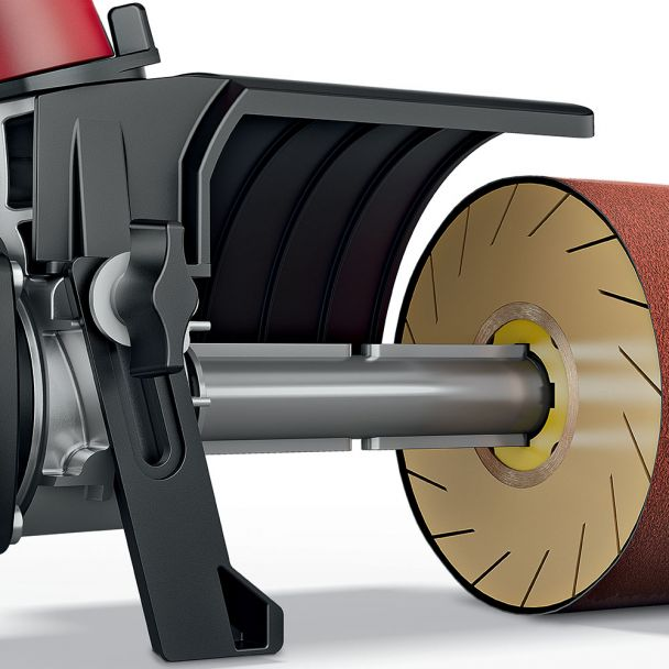 Rolele/periile abrazive se schimba fara scule datorita unui sistem de cuplare patentat, de asemenea benzile de slefuire se schimba rapid fara utilizarea altui instrument.
