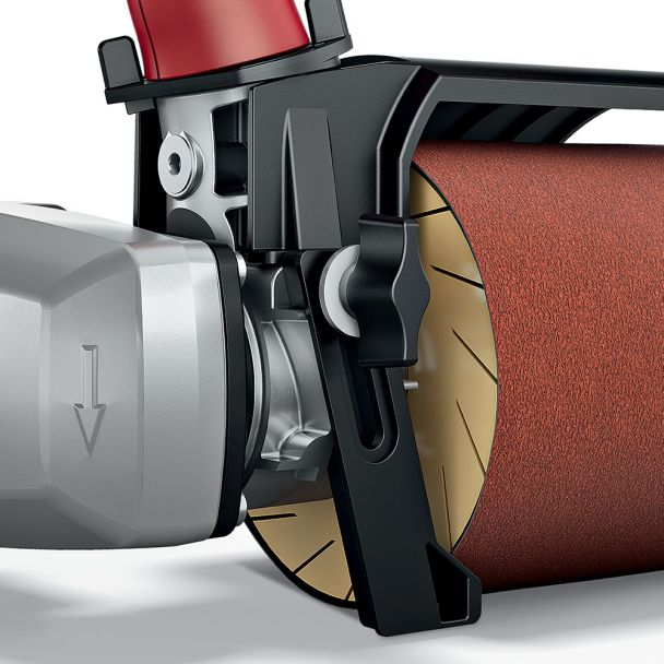 Accesoriul de fixare a rolei/periei este prevazut cu o protectie detasabila si racord de cuplare cu diametrul de 32 mm pentru aspirator. Acest lucru permite eliminarea prafului din zona de lucru. Acest accesoriu include un ghidaj de oprire pentru calibrarea pieselor inguste pentru rectificarea dupa model.