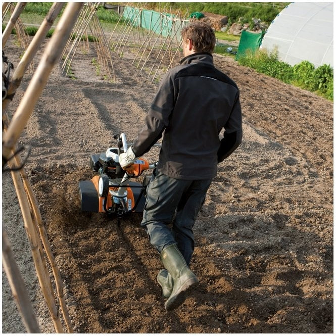 Designul robust al motocultorului STIHL MH 585 il face durabil pentru gradinarii pasionati, peisagisti si legumicultori, precum si pentru fermierii care il folosesc pe perioade mai lungi de timp in straturi sau pe camp. Ca o caracteristica speciala, motocultorul de gradina MH 585 are un set de sape divizibile pentru a reduce latimea de lucru. Acest lucru inseamna ca puteti utiliza o latime de lucru de 85 cm sau 60 cm, dupa cum este necesar, permitand chiar si plantatiile mai inguste sa fie gestionate eficient si delicat. Motocultorul este actionat de un motor OHV cu sistem de pornire usoara. Treapta de mers inapoi a masinii usureaza manevrarea si resetarea. Pentru o mai mare flexibilitate, motocultorul MH 585 poate fi echipat ulterior cu o freza - fie cu freza variabila STIHL AHK 701, fie cu freza fixa - pentru crearea de brazde, precum si cu roti de fier STIHL AM 031. Sistemul anti-vibratii STIHL integrat asigura un confort semnificativ imbunatatit in timp ce utilizati motocultorul STIHL MH 585 prin reducerea vibratiilor de pe bara reglabila pe inaltime si lateral. De asemenea, forma speciala elicoidala a lamelor de pe sapa va economiseste forta si solul se marunseste in timp ce utilajul sapa. In acelasi timp, puteti regla cu usurinta viteza, accesand o maneta doar cu degetul mare, in timpul lucrului. Pintenul de franare reglabil al motocultorului STIHL MH 585 poate fi reglat la trei niveluri diferite si mentine utilajul pe brazda sa in timp ce il manevrati. Dupa ce ati terminat de lucrat, motocultorul poate fi trecut cu usurinta in pozitia de curatare si poate fi mutat fara efort datorita rotilor de transport pliabile.