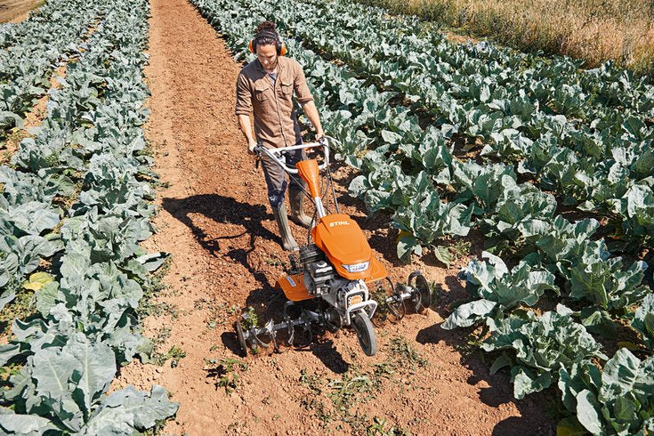Motosapa STIHL MH 700 motor 7 CP benzina 2+1 viteze latime lucru 98-121 cm freze roti cauciuc 4.00x8" roti metal cultivator plug reversibil 4l ulei