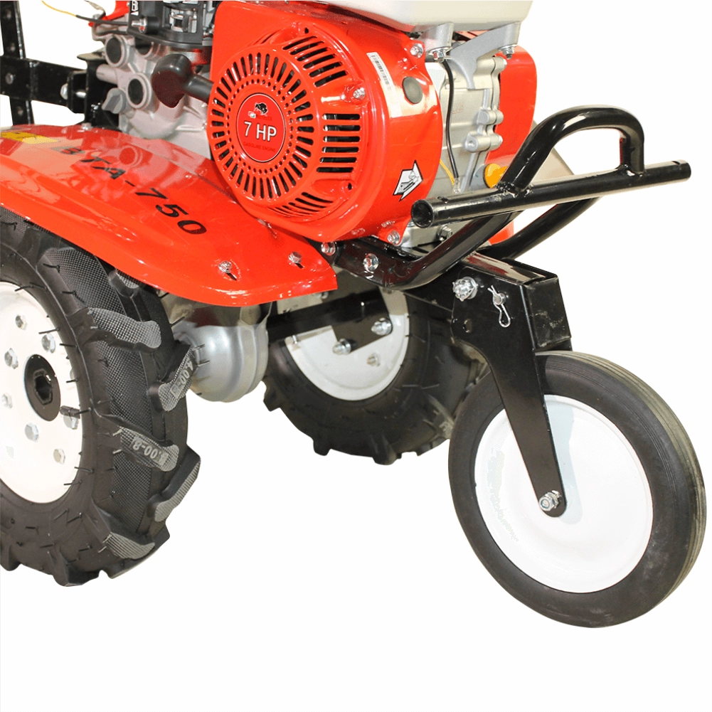 Suport de transport al frezelor care ajută la deplasarea motocultorului pe roți către zona de lucru cu frezele montate pe suportul de transport.