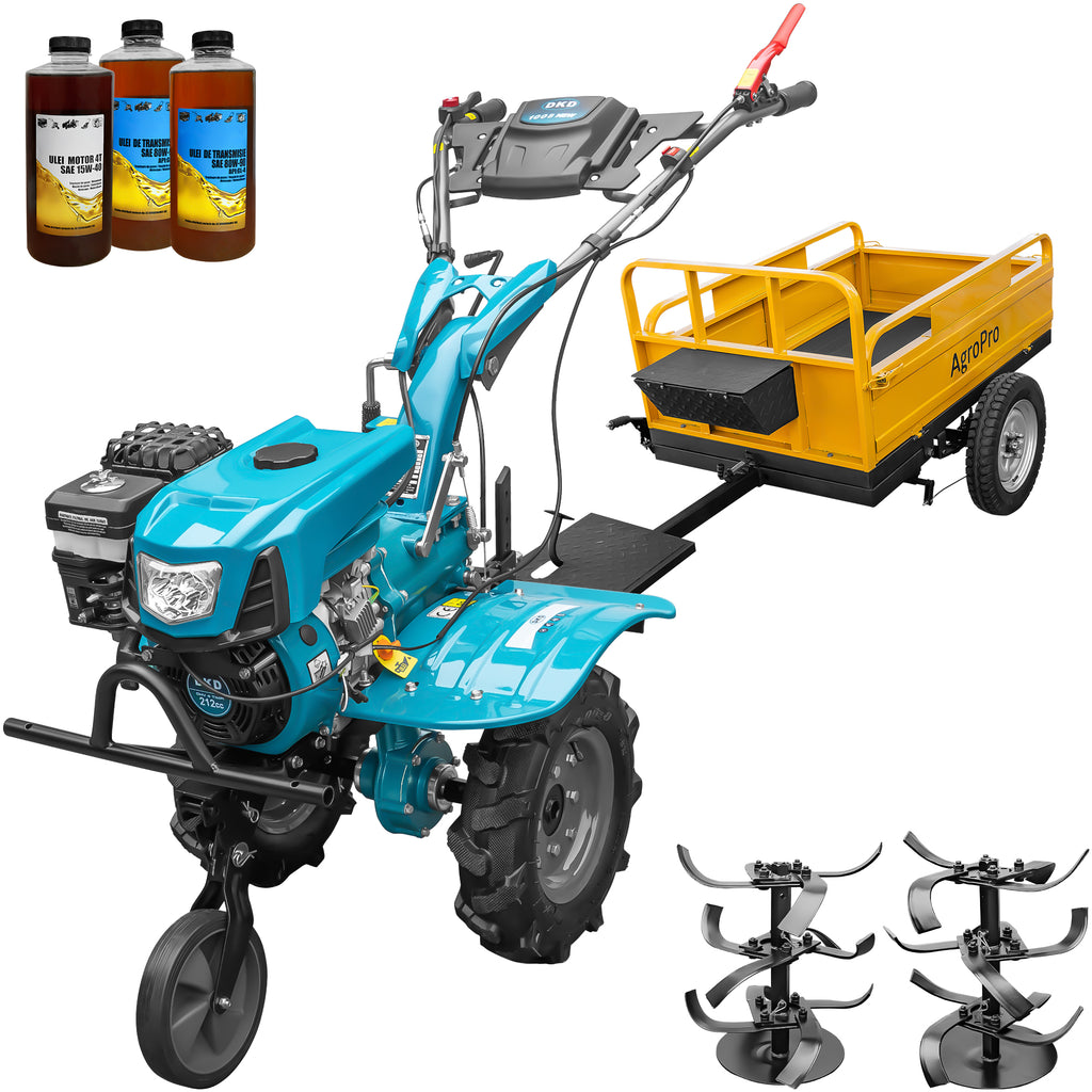 Motocultor DKD 100B NEW motor 7 CP benzina 2+1 viteze latime lucru 50-89 cm freze roti cauciuc 4.00x8" capota cu far LED remorca 3l ulei