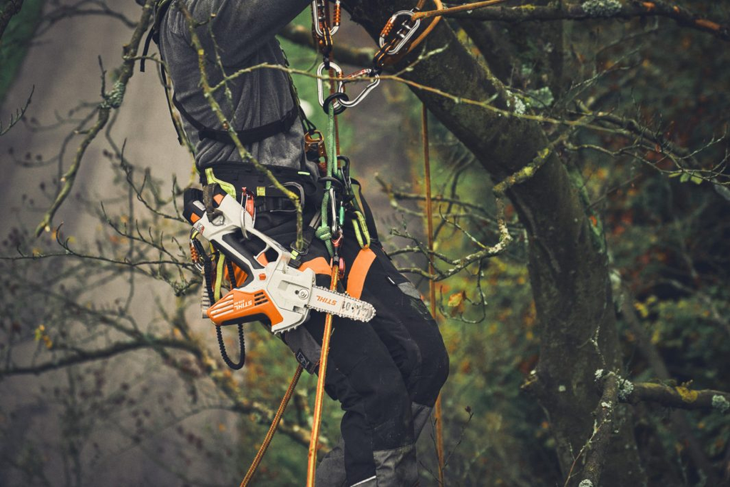 INEL SUPRASARCINAPentru a asigura mașina de tuns copaci împotriva căderii în timpul lucrărilor de cățărare, inelul de suprasarcină inclus în pachetul de livrare este agățat de unul dintre inelele suspendate pe ambele părți și apoi atașat de ham de cățărat cu ajutorul unui cârlig cu carabinier și a unei frânghii scurte, pt. exemplu. |
