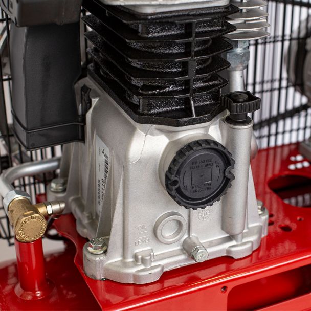 MK103-90-3M este un compresor de aer profesional, cu doua pistoane, actionate prin curea de un motor electric monofazat prevazut cu protectie termica resetabila manual.
