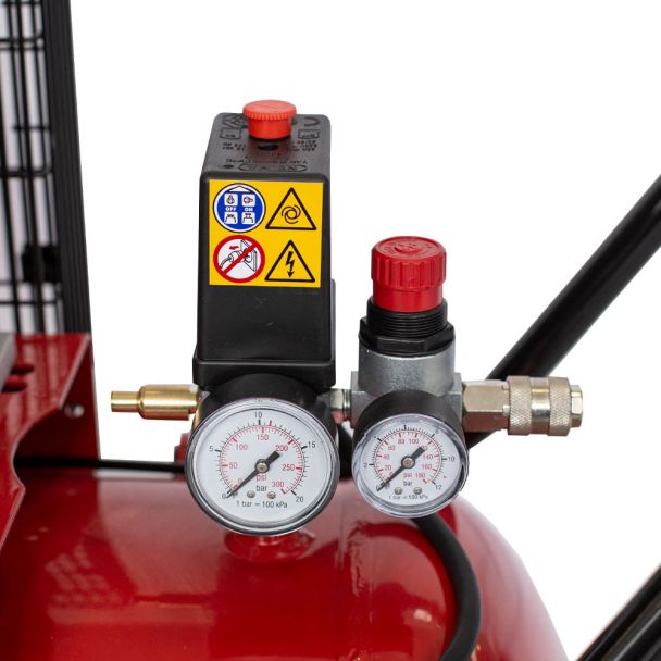 MK103-90-3M are un randament imbunatatit, o constructie robusta si este echipat cu presostat, regulator de presiune, manometru, supapa de siguranta, robinet de purjare, roti, maner pentru transport si suport antivibratii.
